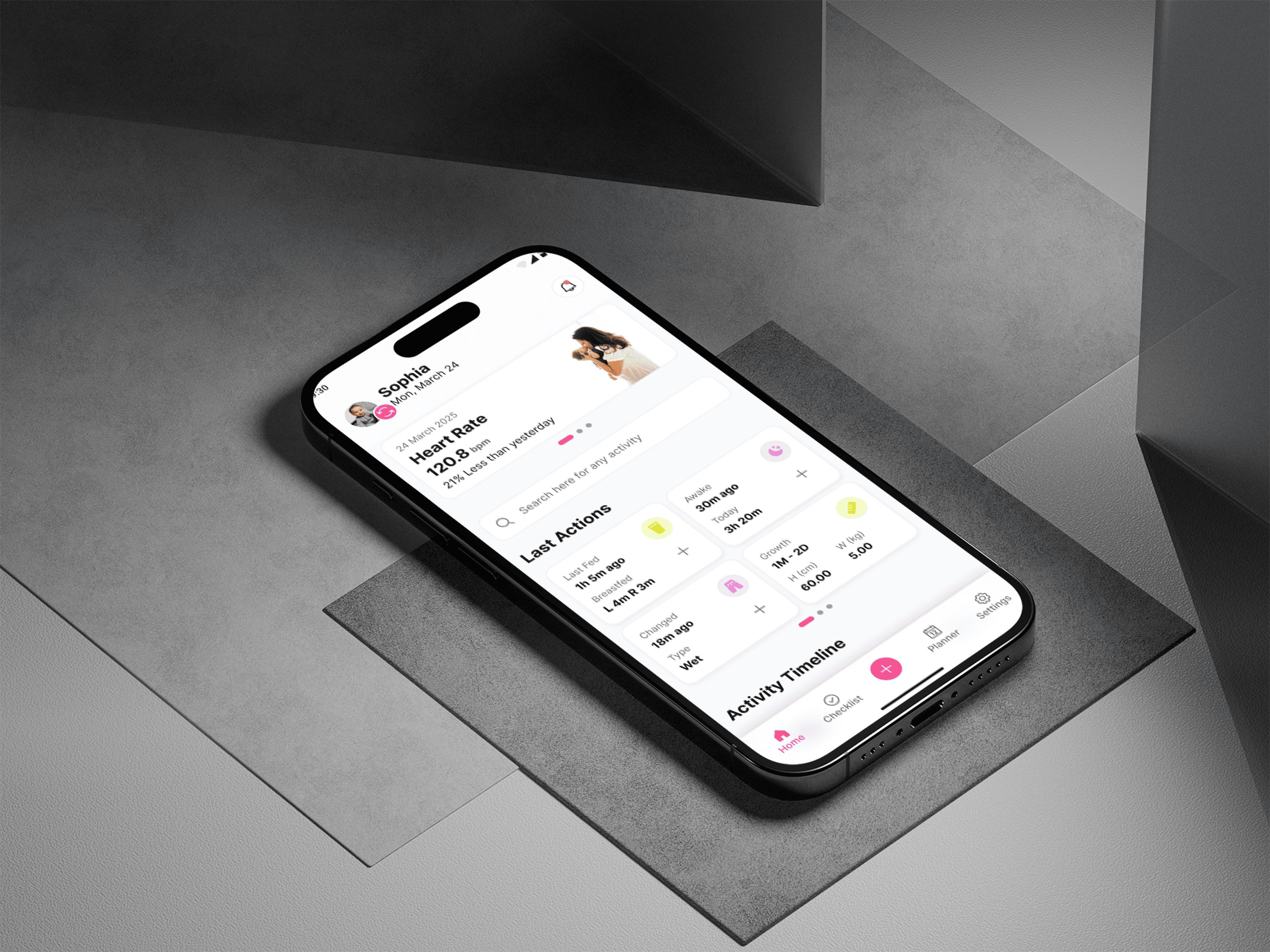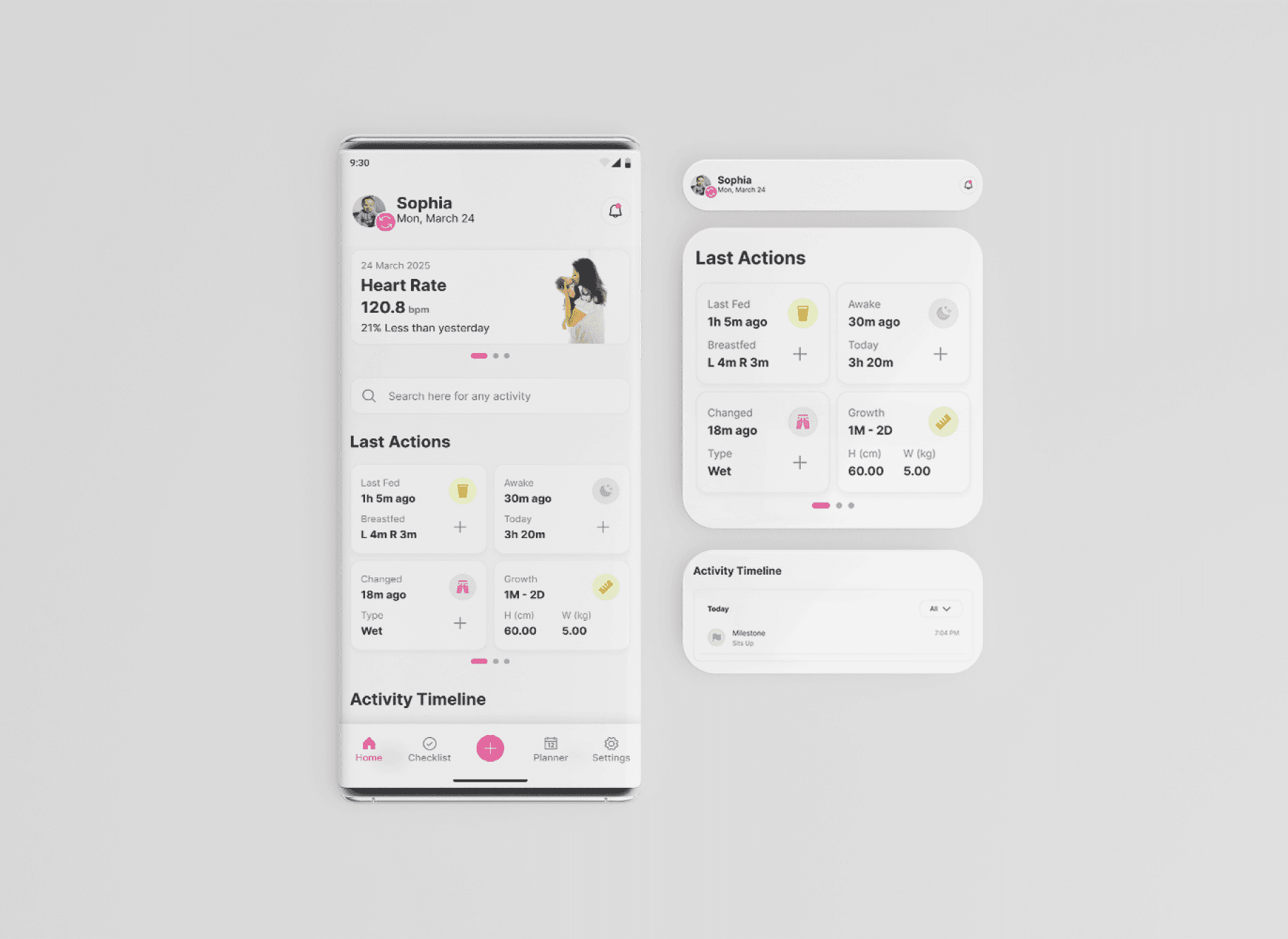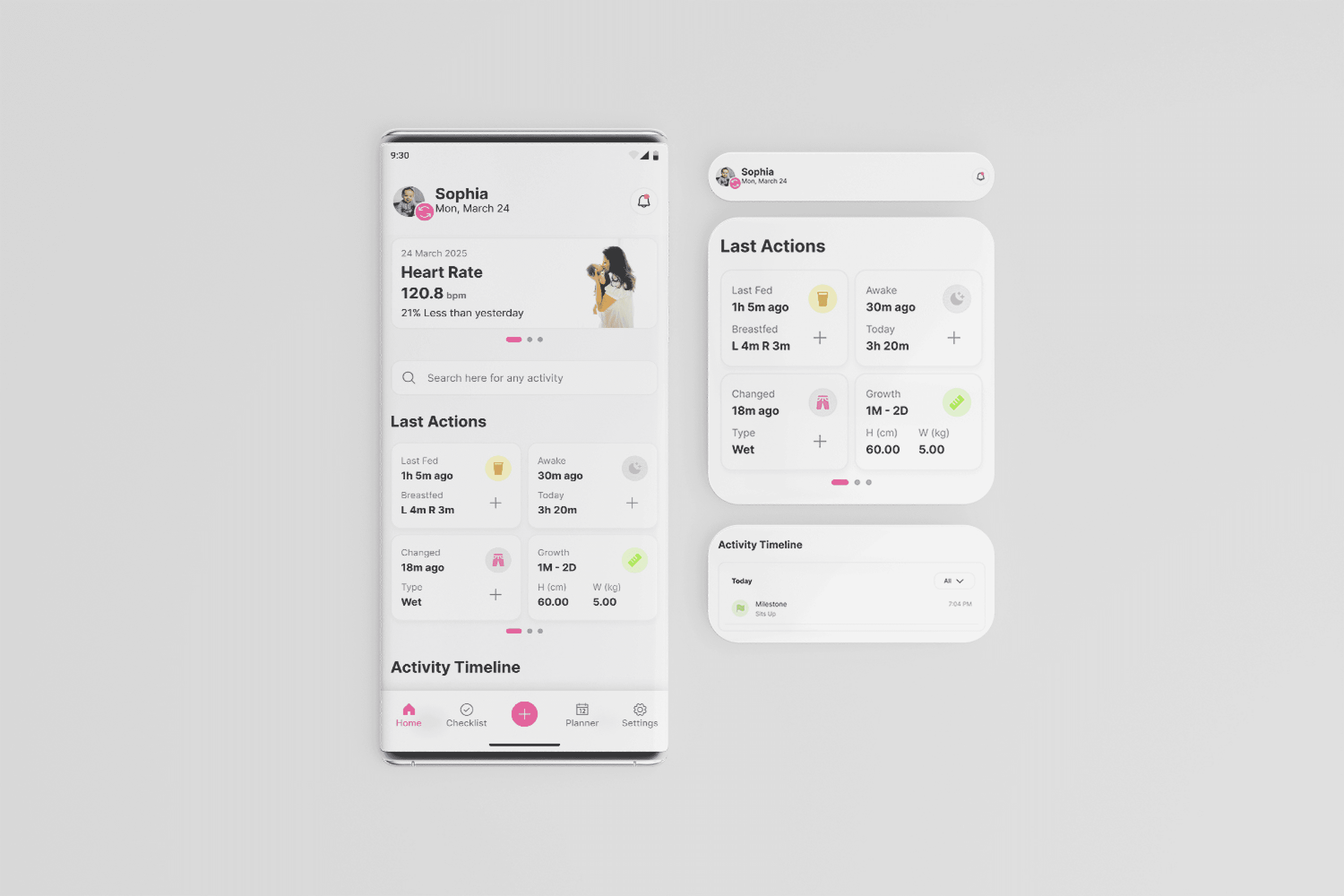 Well, to create the right components of this application, I blended simplicity with usability to find the right hierarchy of the information as well as components. I placed a switch profile option in the corner, for the parents who have more than one baby. The suggestion cards, can be really helpful for showing tips and useful for having a glance at information. Then a set of most repeated and essential actions followed by the timeline.