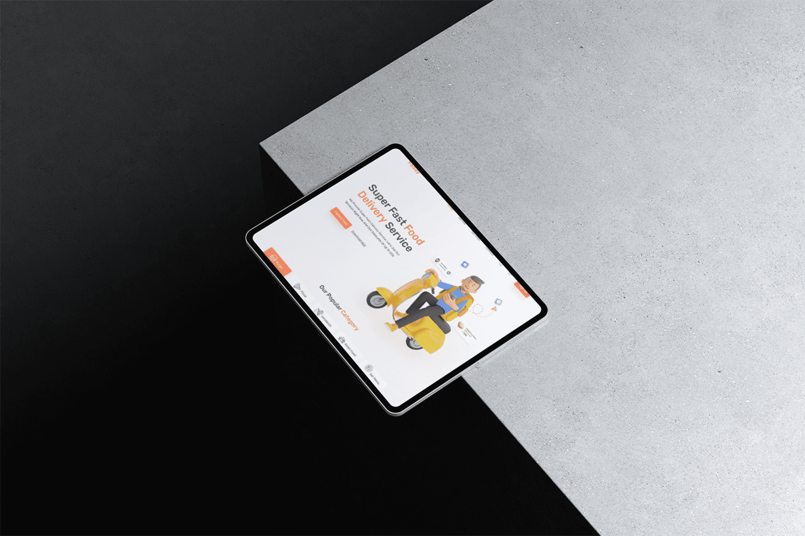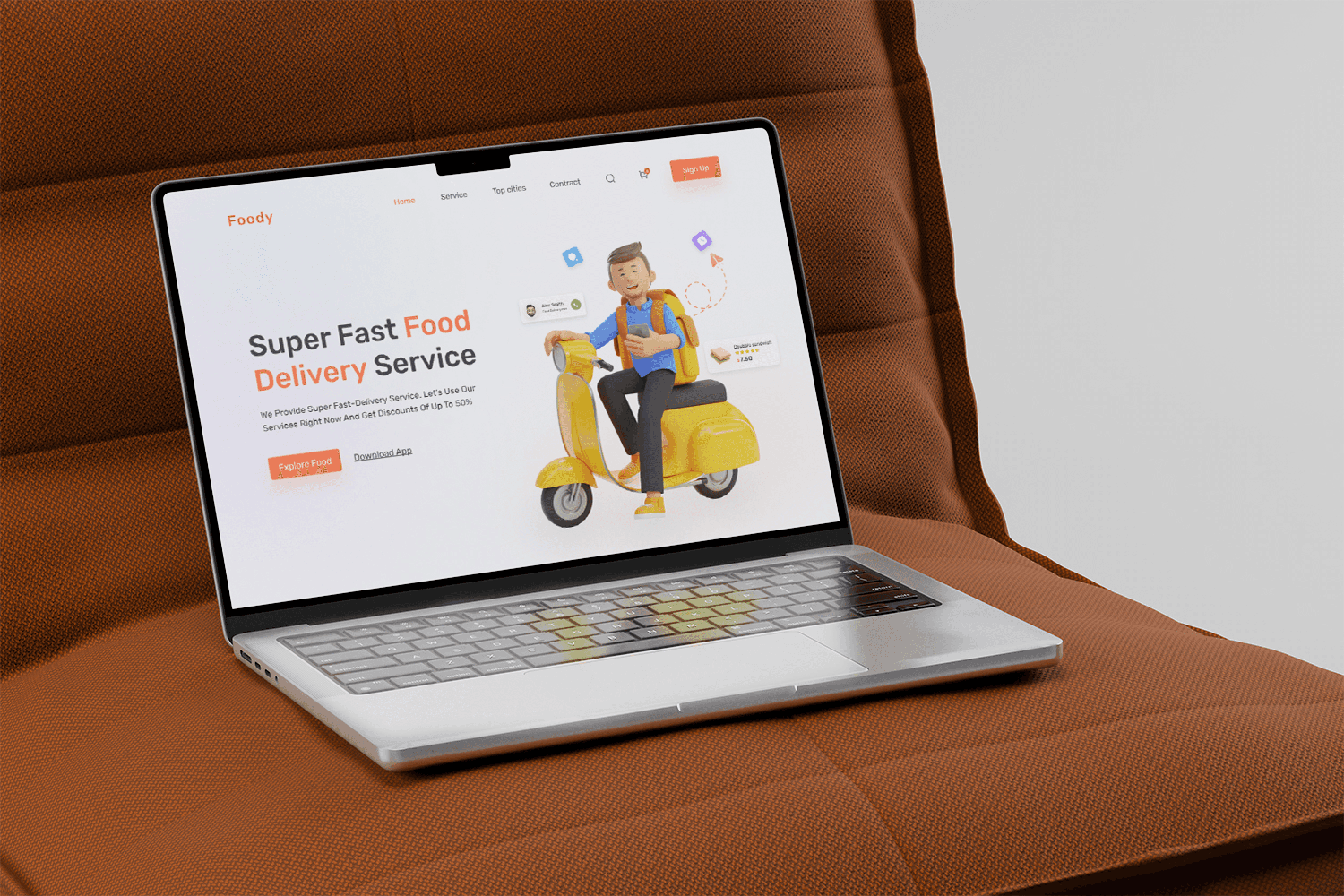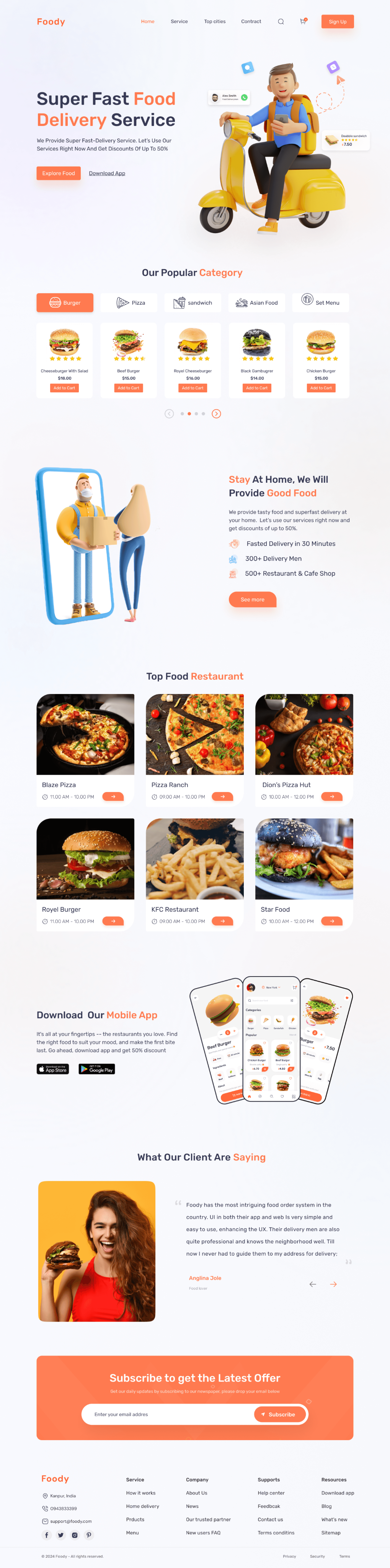 Landing page for a fast food delivery service offering a wide range from burgers to Asian set meals designed to emphasize speed, variety, and comfort at home.