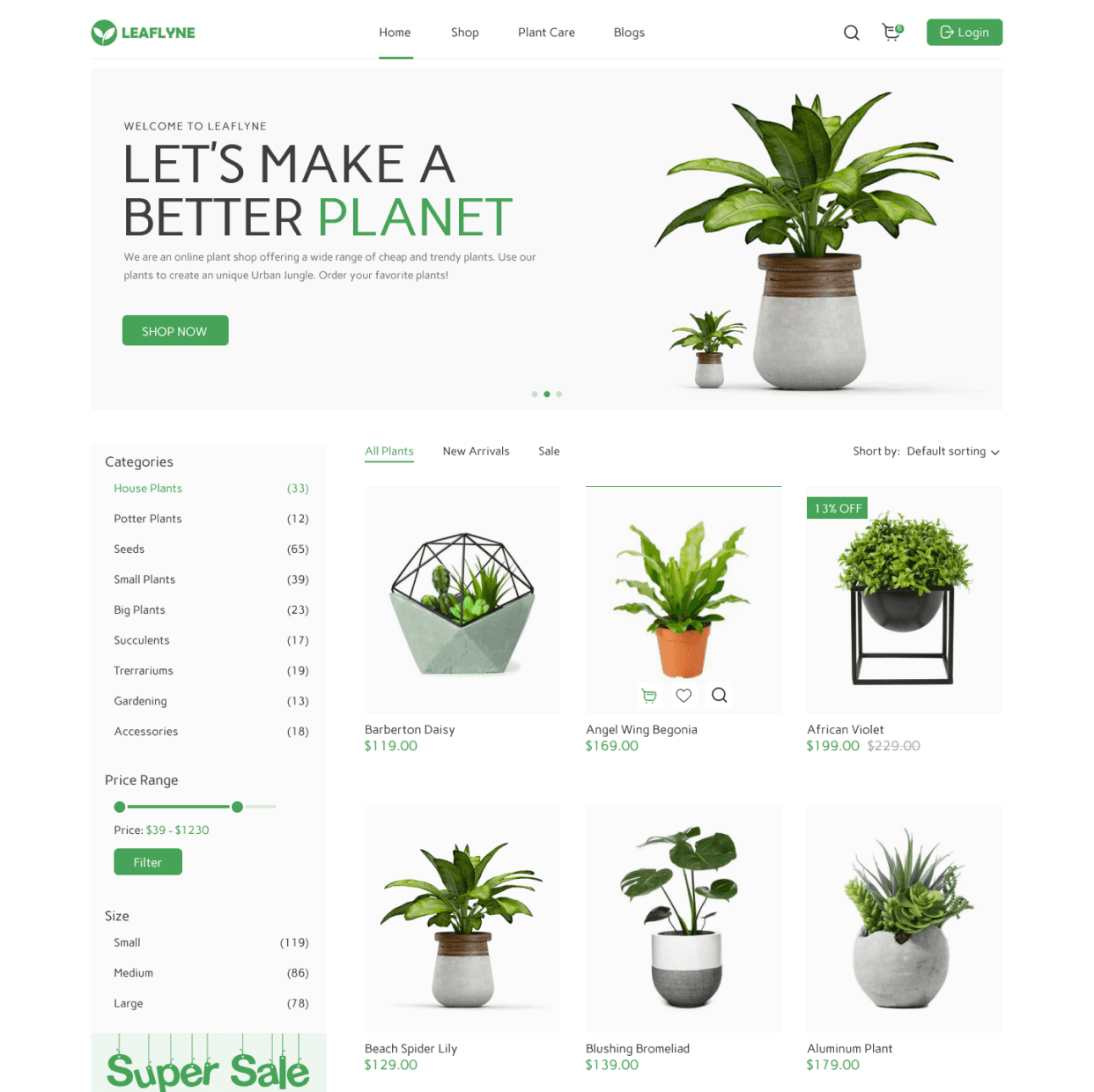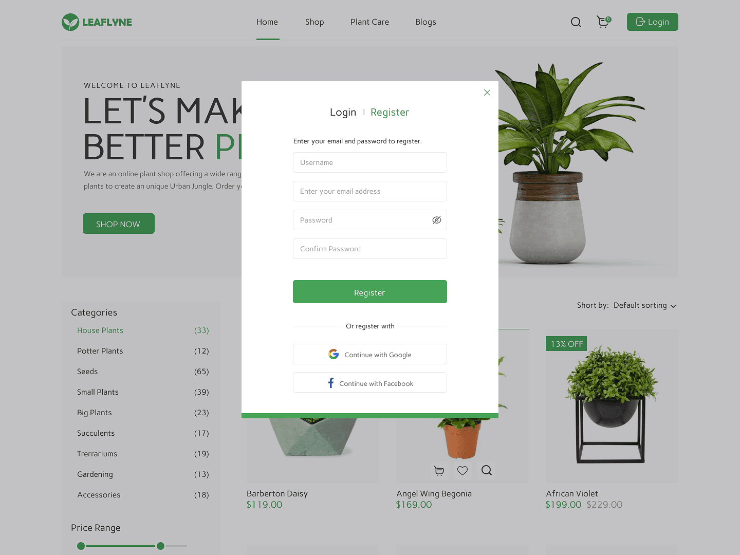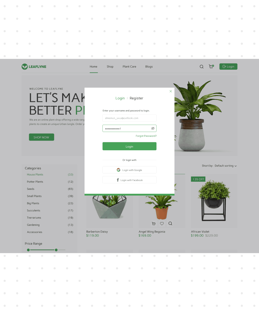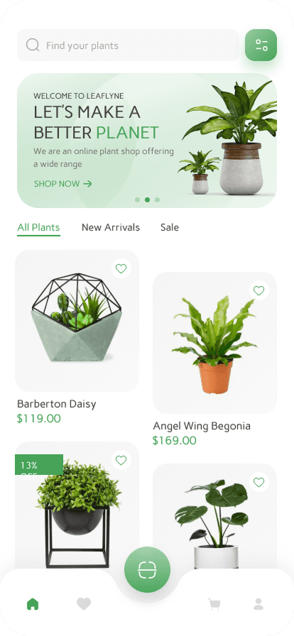 A B2C e-commerce platform for trendy, affordable plants. Designed web and mobile app interfaces with simple prototyping and a vibrant landing experience.